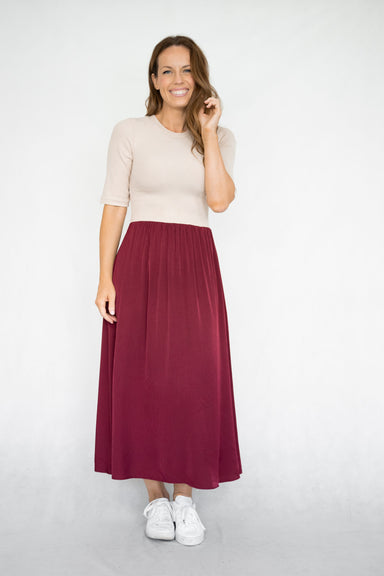 THE DETAILS The Sasha Dress is your effortless all-rounder. Featuring a soft, stretch knit bodice and a flowing burgandy skirt, it’s designed fo...
