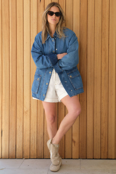 View full detailsTHE DETAILS Introducing our Denim Side Pocket Shacket - the perfect blend of style and functionality. Made from heavier weight rigid denim, this...